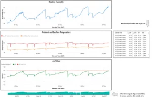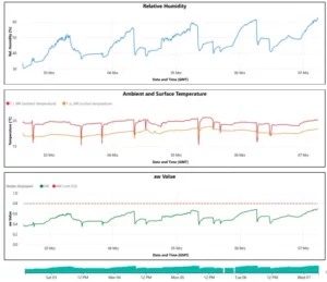 Für die Bestimmung der Oberflächen- und Raumfeuchte wurde ein Feuchtemesssensorknoten im Raum und ein Wärmefluss/Oberflächentemperatursensorknoten an der Problemzone installiert.